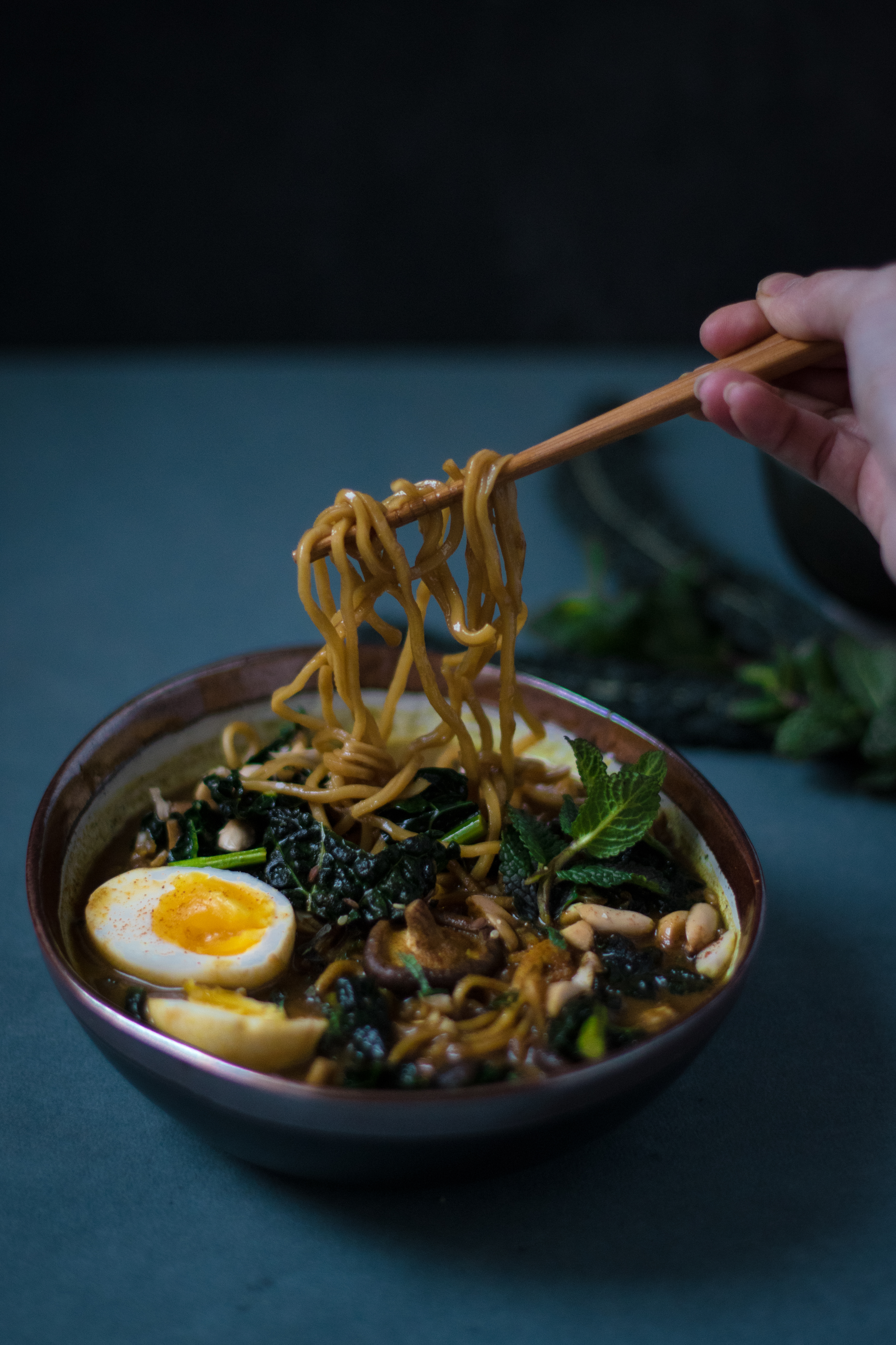 This coconut curried noodle soup with kale & peanuts came on the top of my long winter recipe list, all shot on-the-go between 2 appointments, while running everywhere to succeed to grab the last “sun”beams of the day before Berlin winter imposes once again its unbearable darkness at 4pm.