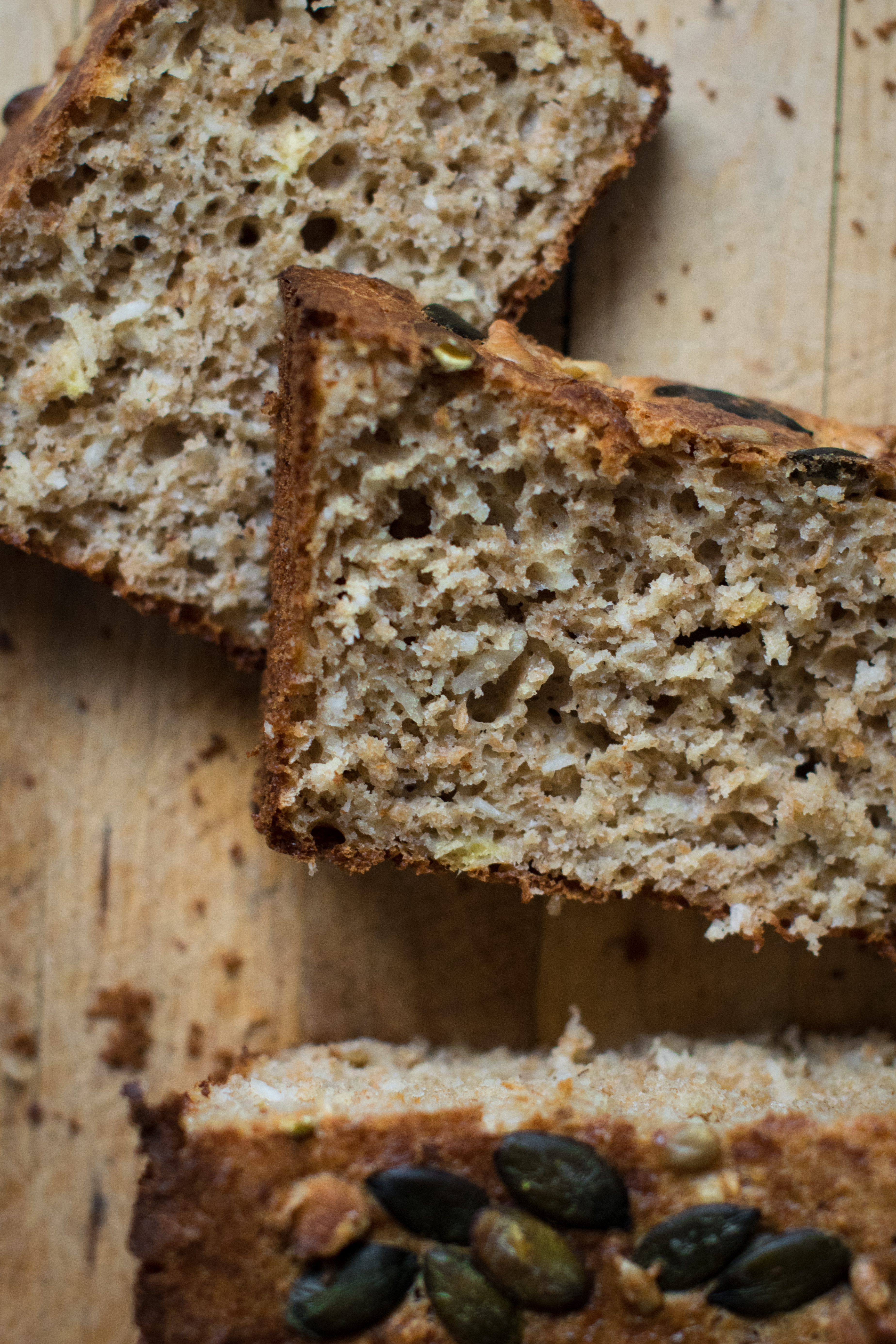 - 4. Preheat oven to 180C. Sprinkle whole spelt banana and coconut bread with walnuts and seeds, then put in oven for 25 minutes. Serve warm or cold.