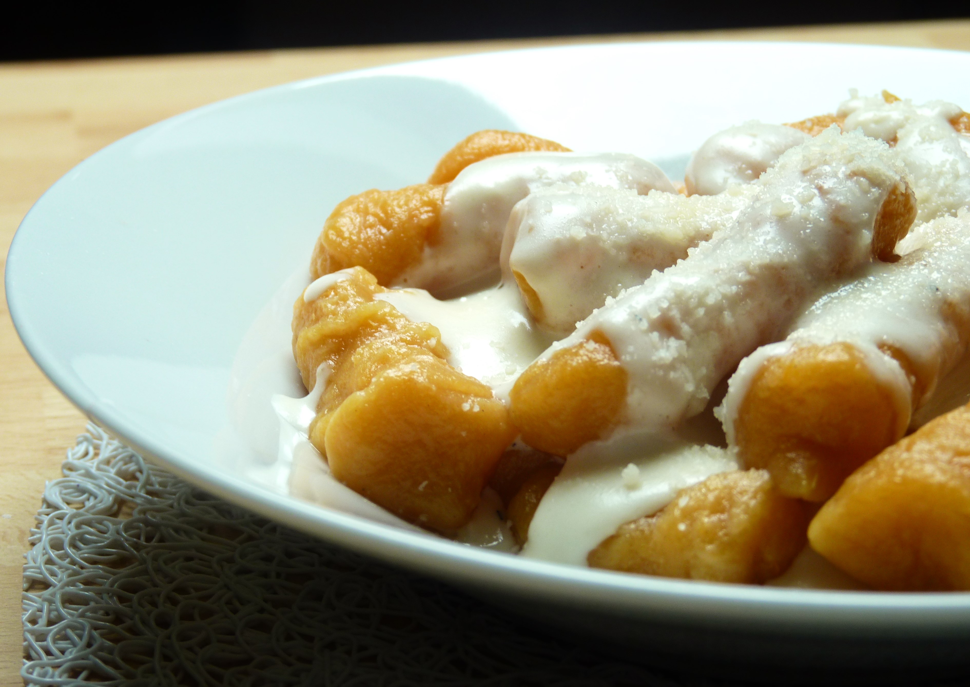 3. 3. Une fois la pâte à gnocchis reposée, la travailler sur un plan de travail légèrement fariné et la séparer en 2 pâtons. Façonner 2 boudins d’environ 2cm de diamètre, et y découper des gnocchis d’environ 1cm de largeur. Rouler les gnocchis à l’aide de 2 fourchettes afin de leur donner leur forme.